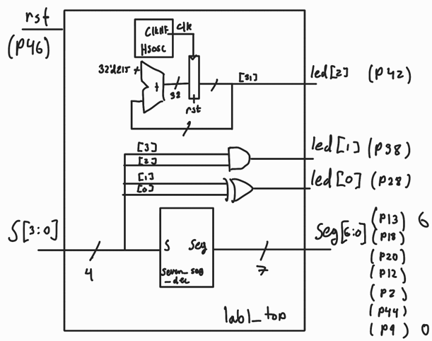 The block diagram in Figure 1 demonstrates the design structure, with the 7:4 decoder, two logic gates, high frequency clock, and clock divider