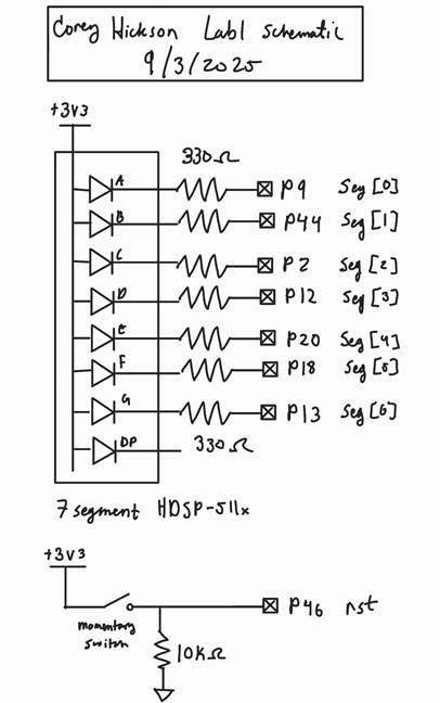 The schematic in Figure 2 demonstrates the phsyical hardware layout of the design, with the seven LEDs of the seven segment display with current limiting resistors, the three on-board LEDs driven by the design, and the input DIP switches.