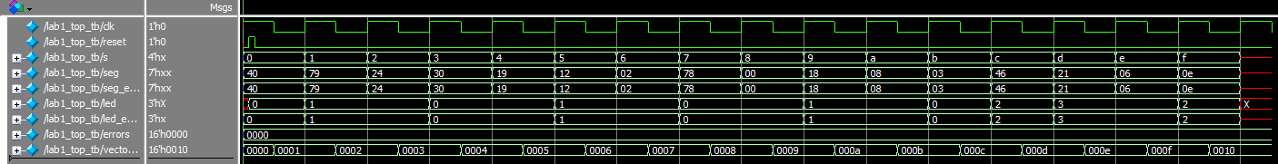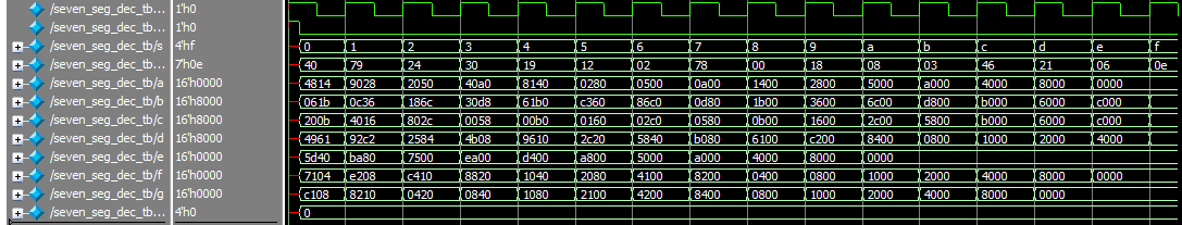 The core part of the design is a 4 to 7 bit decoder for controlling a 7 segment display to display the hex value of a 4 bit input signal. This was created using behavioral SystemVerilog code and was verfified with a simple testbench, where the input signal was incremented from 0000 to 1111 and values for each bit of the decoded output was checked against the expected stream of bits. In hindsight, this was likely a convoluted approach to verification, but since the module is just a truth table, using standard test vectors would essentially mean copying the RTL code to see if it matched itself.