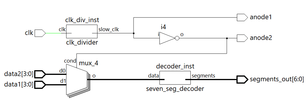 “Write SystemVerilog HDL to time multiplex a single seven segment decoder (that decodes from four bits to a common anode seven segment display) to decode two sets of input bits and drive two sets of seven output bits.”