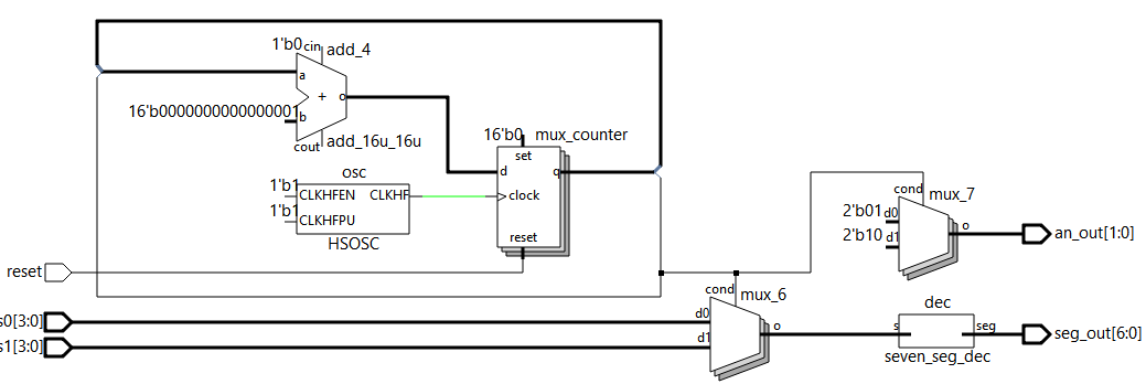 “Write SystemVerilog HDL to time multiplex a single seven segment decoder (that decodes from four bits to a common anode seven segment display) to decode two sets of input bits and drive two sets of seven output bits. Use the seven segment decoder and oscillator provided in the attached files.”