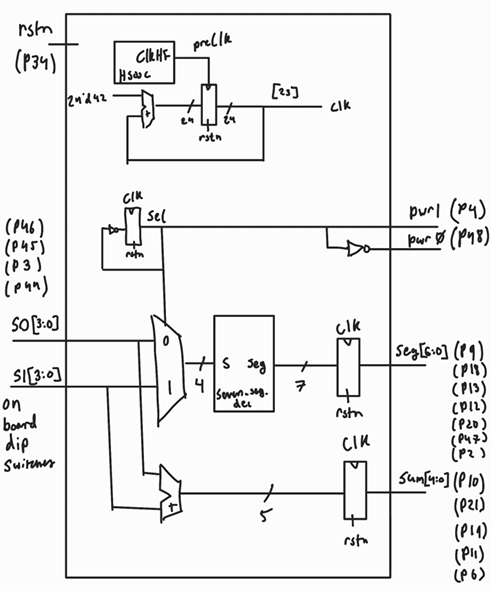 The block diagram in Figure 1 demonstrates the design structure, with the single 7:4 decoder, high frequency clock, clock divider, and a few registers and gates