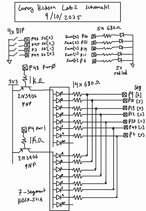 The schematic in Figure 2 demonstrates the phsyical hardware layout of the design, with the two 7-segment displays, 5 additional LEDs, 4 external DIP switches, and 2 PNP transistors.