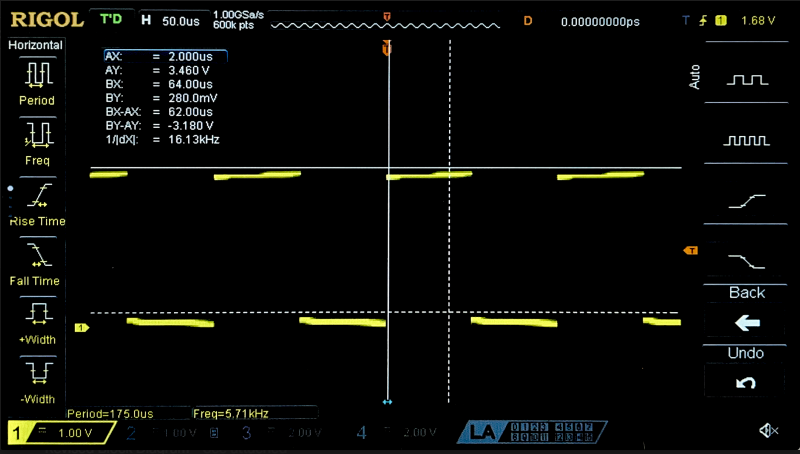 To investigate the advantage of interrupt based timing calculations to polling, I repeated this assignment to use polling instead of interrupts, and in the main while loop toggled a pin to probe the frequency of this sampling.